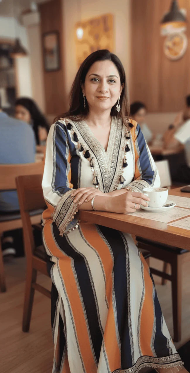 The dress is fully lined with soft butter crepe for all-day comfort and a smooth fall. Its straight silhouette with a 15-inch side slit allows ease of movement while maintaining a graceful look. Beautiful contrast detailing on the neckline, sleeves, and hem adds a refined touch, making it perfect for festive gatherings, brunches, and elegant day wear.